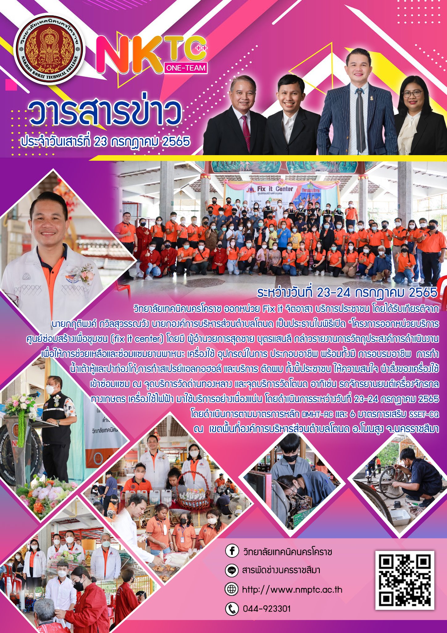 วิทยาลัยเทคนิคนครโคราช ออกหน่วย Fix it จิตอาสา บริการประชาชน โดยได้รับเกียรติจากนายกฤติพงค์ ถวิลสุวรรณวัง นายกองค์การบริหารส่วนตำบลโตนด เป็นประธานในพิธีเปิด “โครงการออกหน่วยบริการศูนย์ซ่อมสร้างเพื่อชุมชน (fix it center) โดยมี ผู้อำนวยการสุดชาย บุตรแสนลี กล่าวรายงานการวัตถุประสงค์การดำเนินงาน เพื่อให้การช่วยเหลือและซ่อมแซมยานพาหนะ เครื่องใช้ อุปกรณ์ในการ ประกอบอาชีพ พร้อมทั้งมี การอบรมอาชีพ การทำน้ำเต้าหู้และปาท่องโก๋,การทำสเปรย์แอลกอฮอล์ และบริการ ตัดผม ทั้งนี้ประชาชน ให้ความสนใจ นำสิ่งของเครื่องใช้เข้าซ่อมแซม ณ จุดบริการวัดด่านทองหลาง เเละจุดบริการวัดโตนด อาทิเช่น รถจักรยานยนต์เครื่องจักรกลทางเกษตร เครื่องใช้ไฟฟ้า มาใช้บริการอย่างเนื่องแน่น โดยดำเนินการระหว่างวันที่ 23-24 กรกฎาคม 2565 โดยดำเนินการตามมาตรการหลัก DMHT-RC และ 6 มาตรการเสริม SSET-CQ ณ เขตพื้นที่องค์การบริหารส่วนตำบลโตนด อ.โนนสูง จ.นครราชสีมา